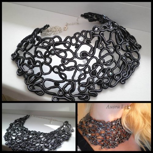 Papuošalai kūriami daugiausiai sutažo technika su įvairiais akmenukais, natūraliu gintaru, swarovski kristalais .