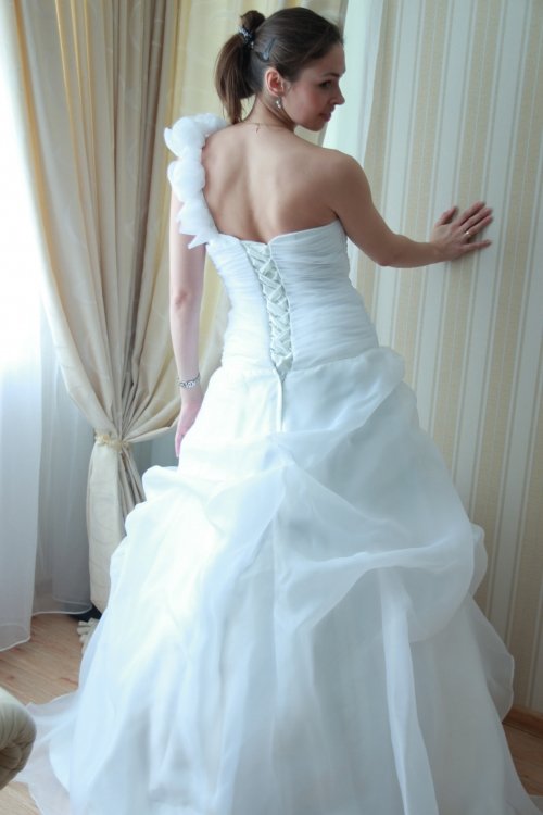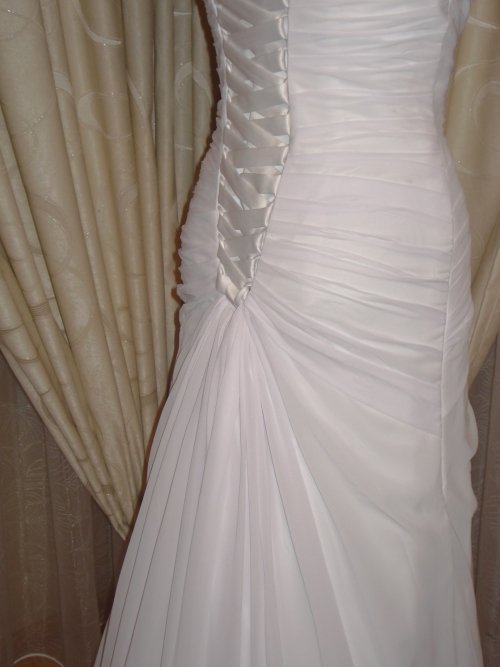 Elegantiška į apačią platėjanti suknele su šleifu tinka nešiojančioms 34-36 dydį, gal net 38. Modelis iš Luisa Sposa kolekcijos. Esant reikalui šleifa galima prisegti. Kaina 200 EUR