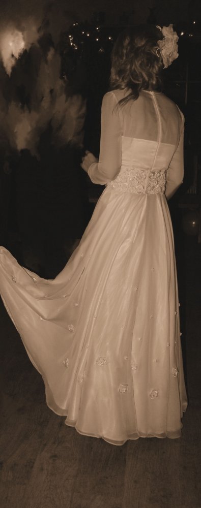 Suknelės diržas pasiūtas iš mažų rožyčių - itin pabrėžia liemenį. Suknelės apačia - kliošinė - pasiūta iš kelių sluoksnių, ant viršutinio sluoksnio saikingai apsiūta rožėmis.