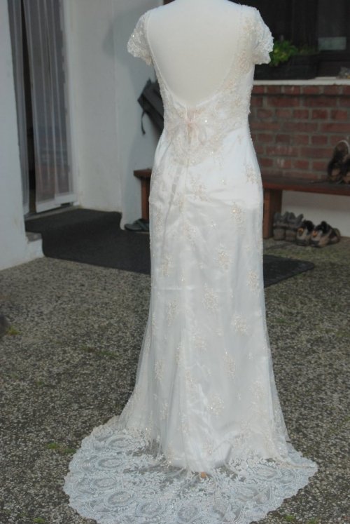 Tiek suknute, tiek batelius devejau viena karta. Suknute isvalyta ir atrodo kaip nauja: tik noreciau pamineti, keletoje vietu yra truputeli atsilaisvines siulas (zr. nuotraukas), kur pritvirtinti karoliukai, tai manau, jog arba teks paciai busimajai nuotakai valandike prisesti ar tiesiog nunesti pas siuveja, kad tvirciau prisiutu...:)