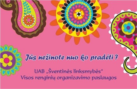 | Mūsų įsipareigojimas Jums- suteikti individualias, Jūsų asmeninius poreikius atitinkančias paslaugas : nuo pakvietimų iki pilno šventės aptarnavimo. Lai šventė suskamba spalvingiausiais akordais. |